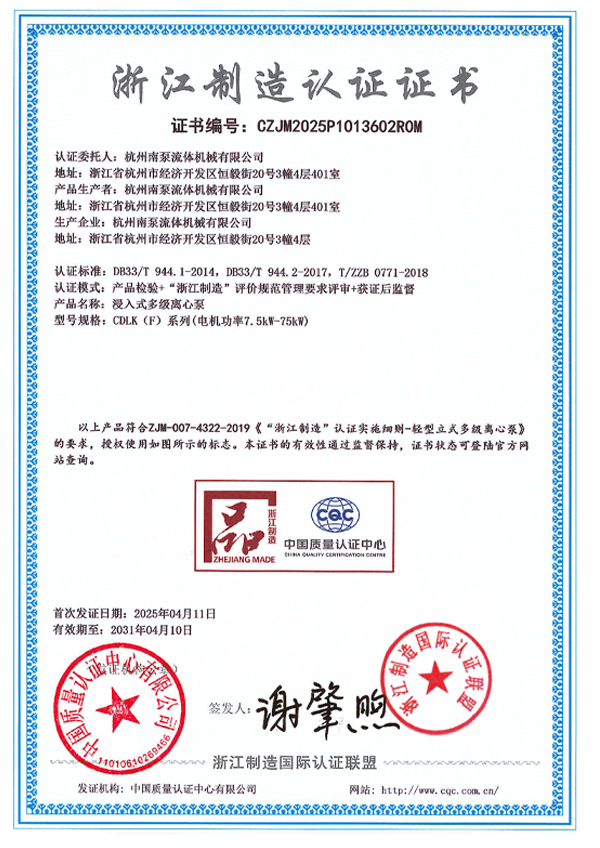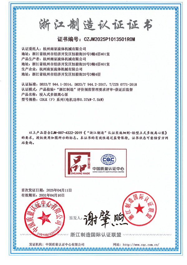 浙江制造認證證書-CDL(F)系列(電機功率0.37kW-7.5kW)